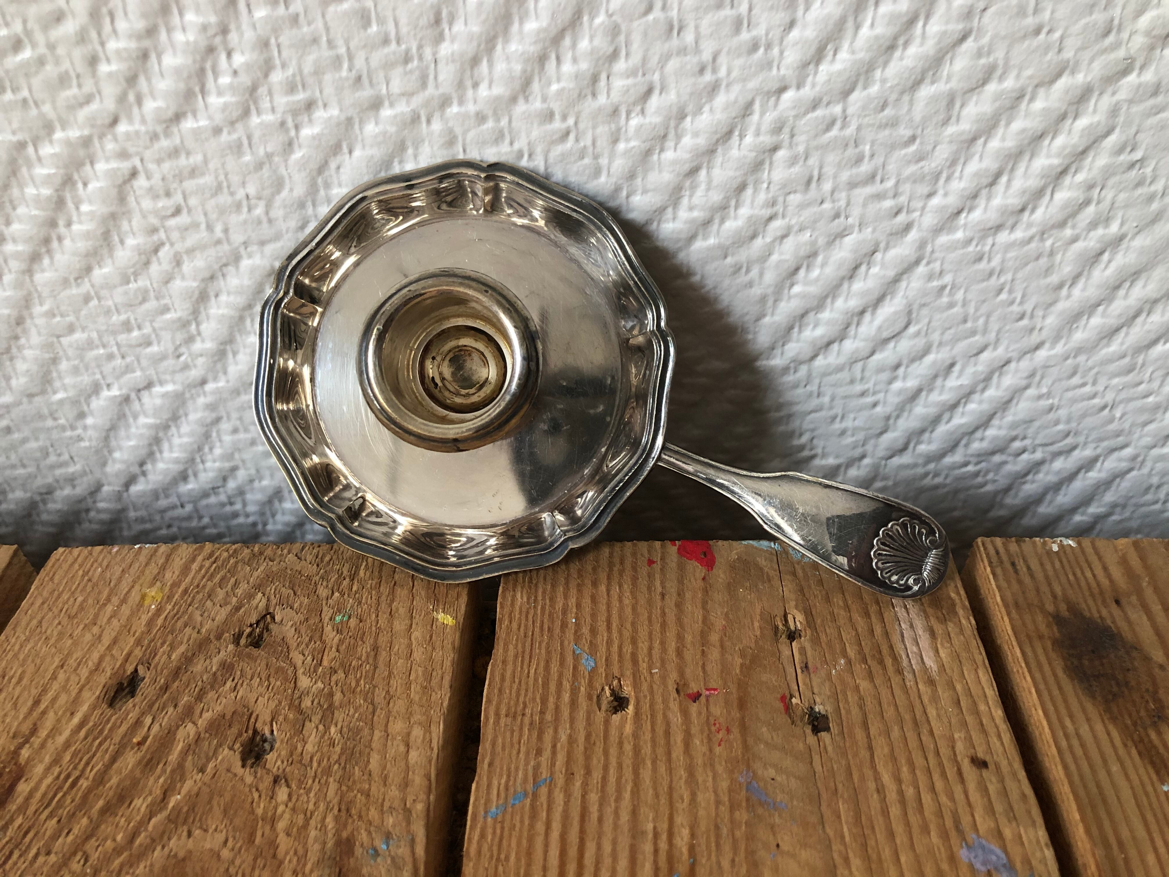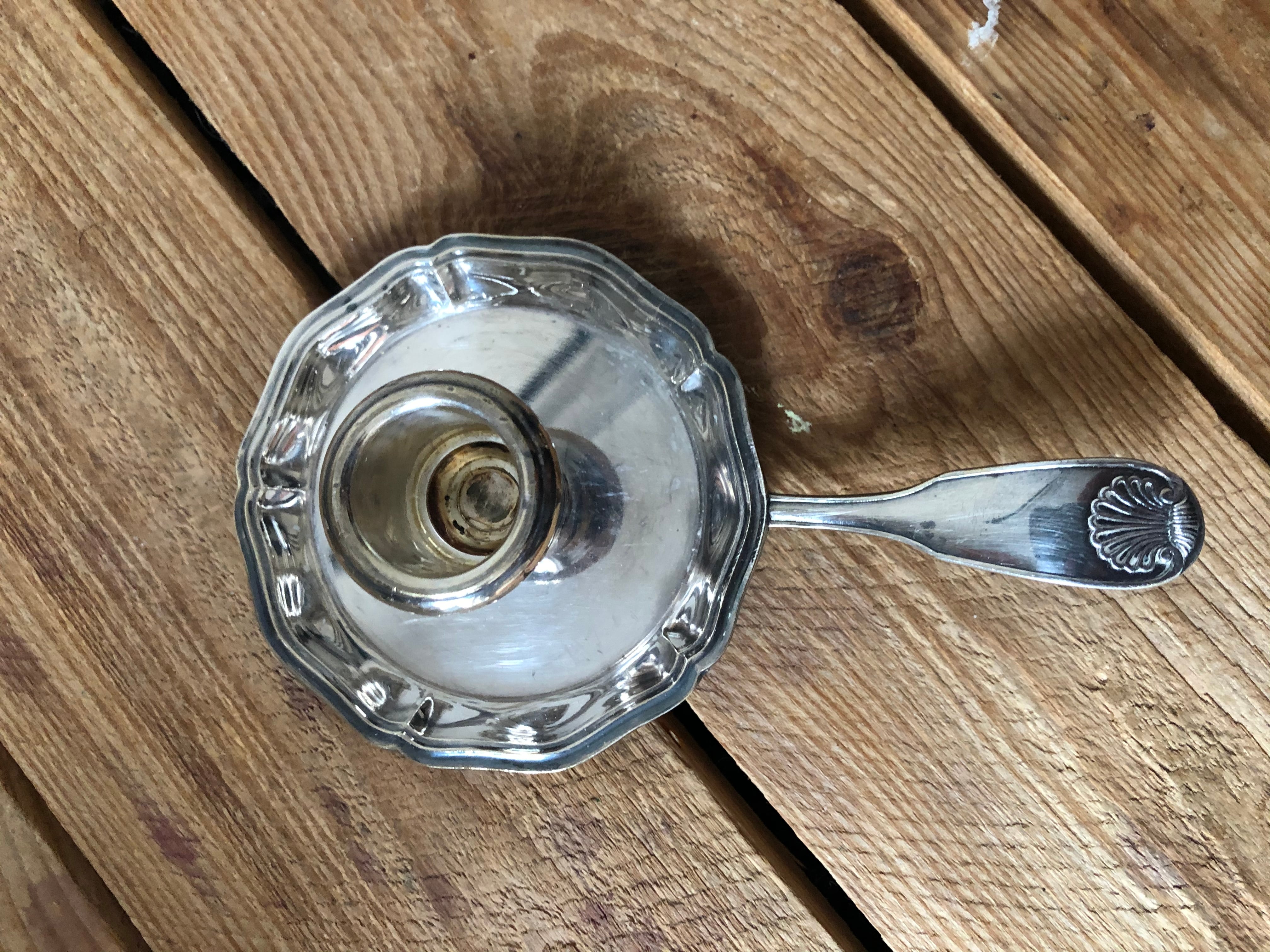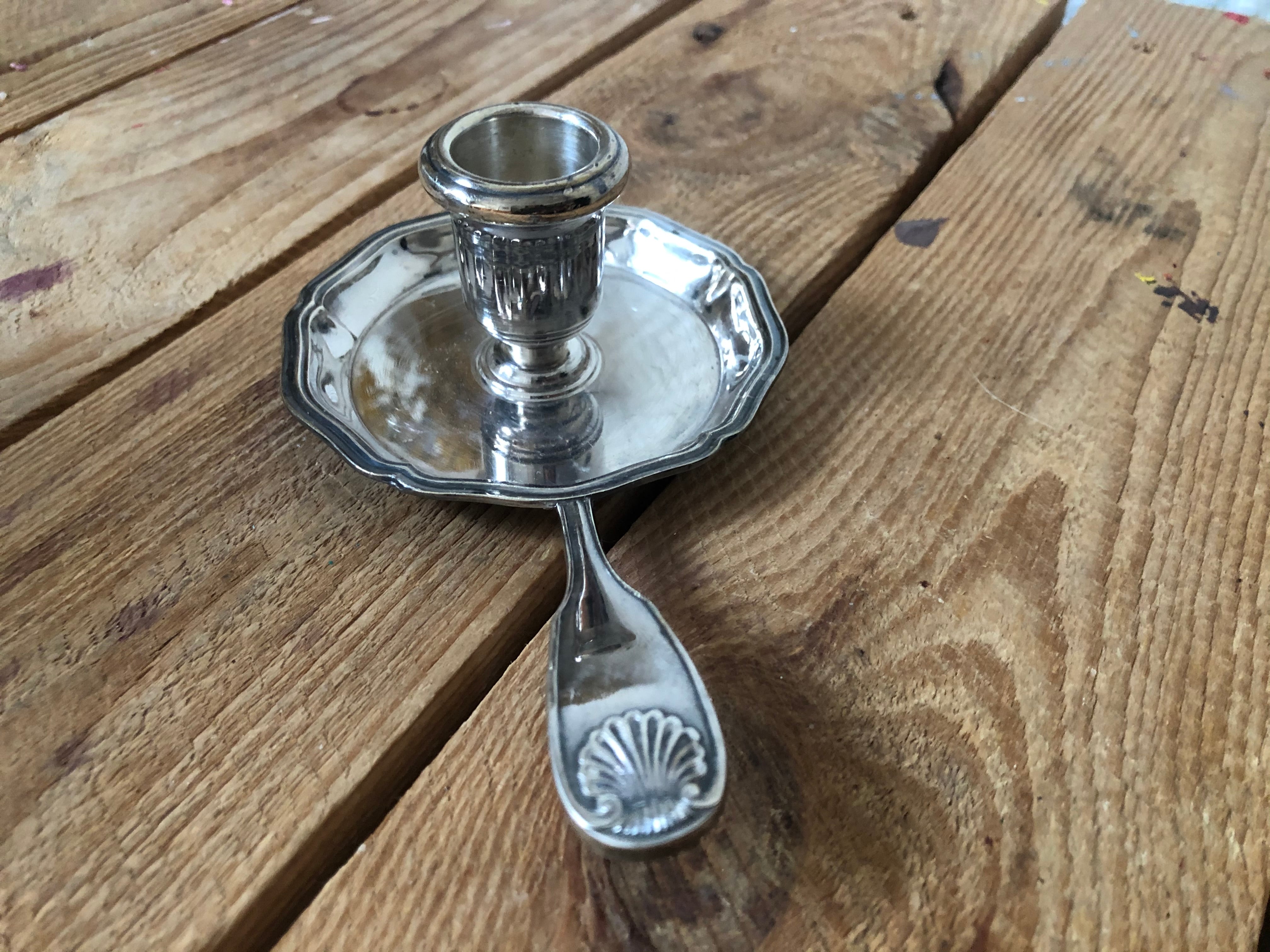 その昔は、ベッドに行く時にキャンドルを灯して枕元に置く為に使われていた、取っ手が付いたキャンドルスタンドです。