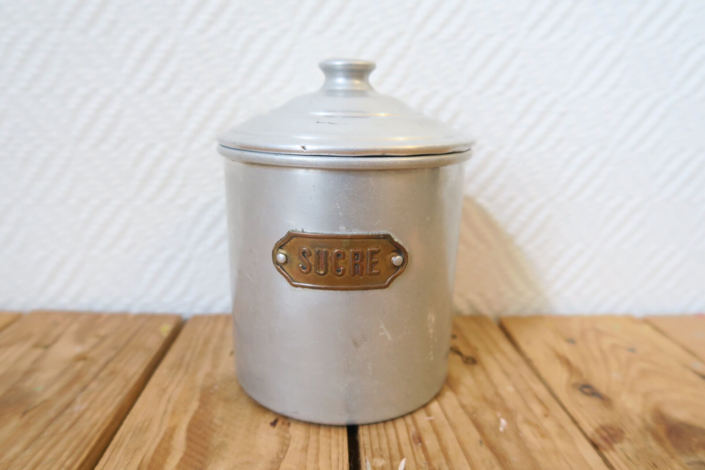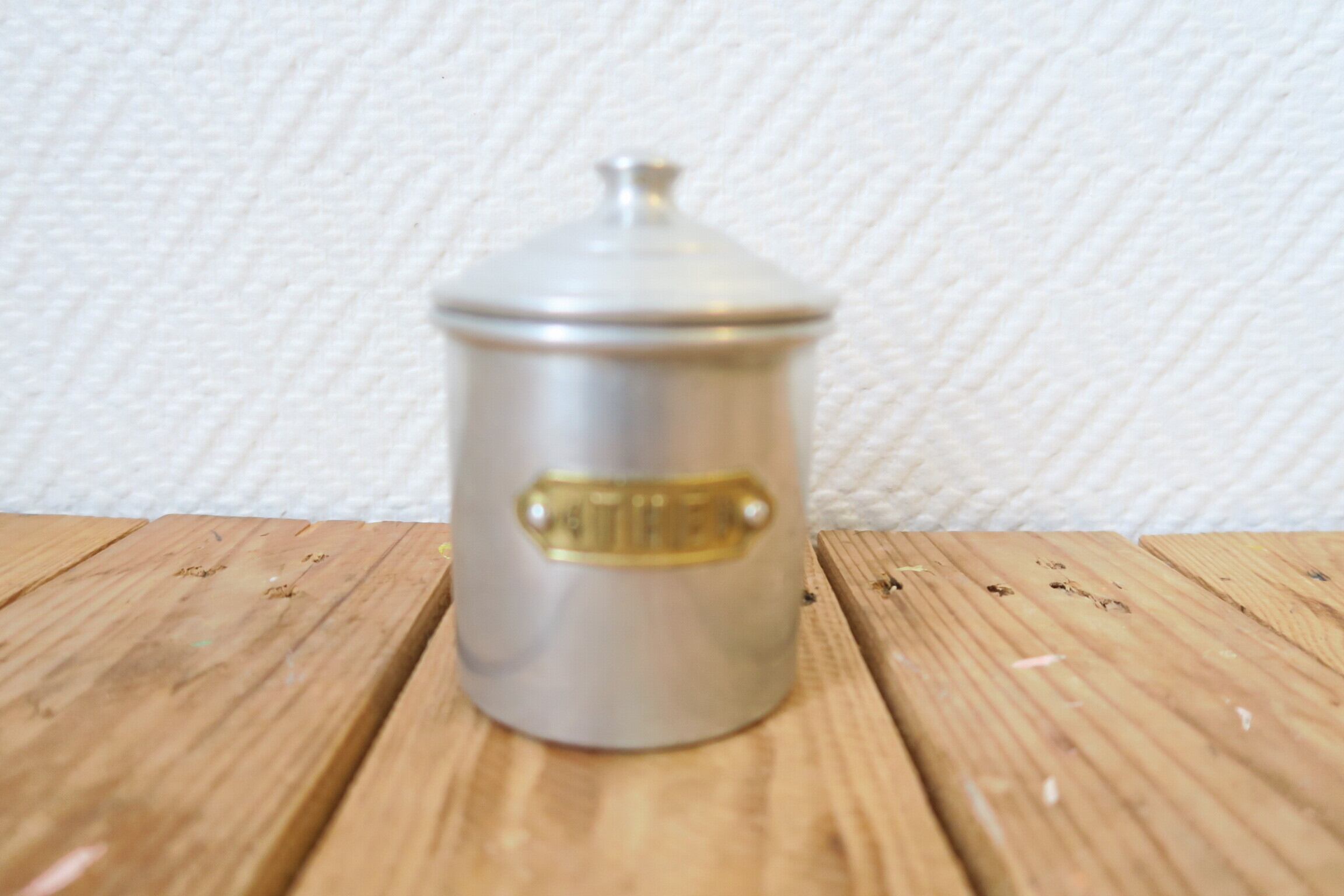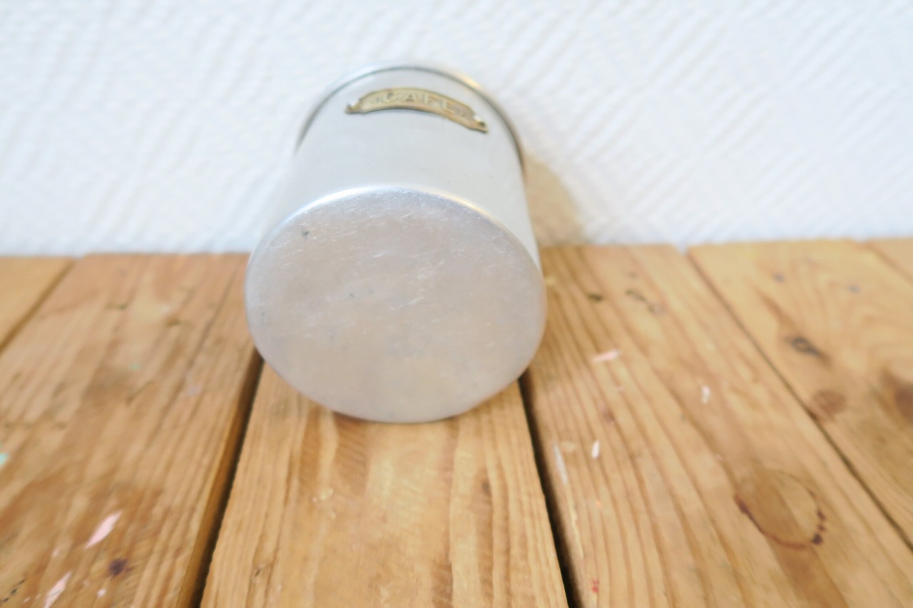 真鍮プレートやアルミの風合いや質感がとても素敵な、フランスの家庭で長く使われていた、ヴィンテージのアルミ製キャニスターです。