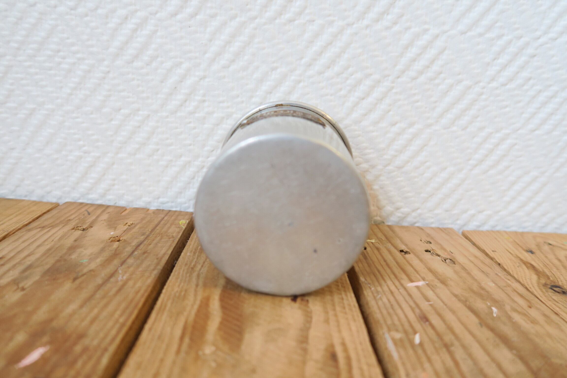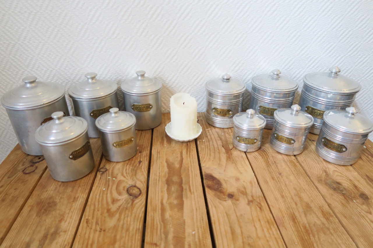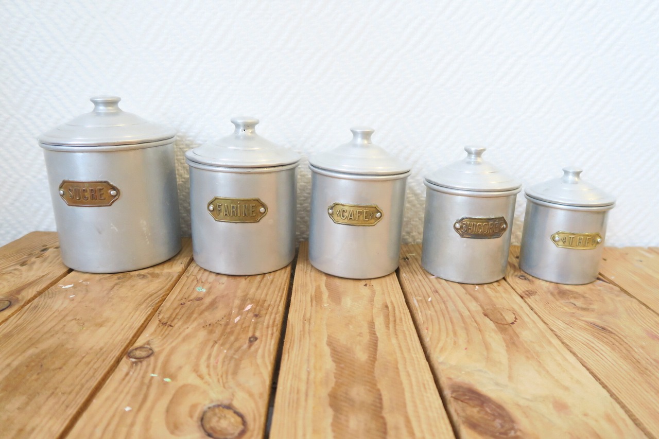 真鍮プレートやアルミの風合いや質感がとても素敵な、フランスの家庭で長く使われていた、ヴィンテージのアルミ製キャニスターです。