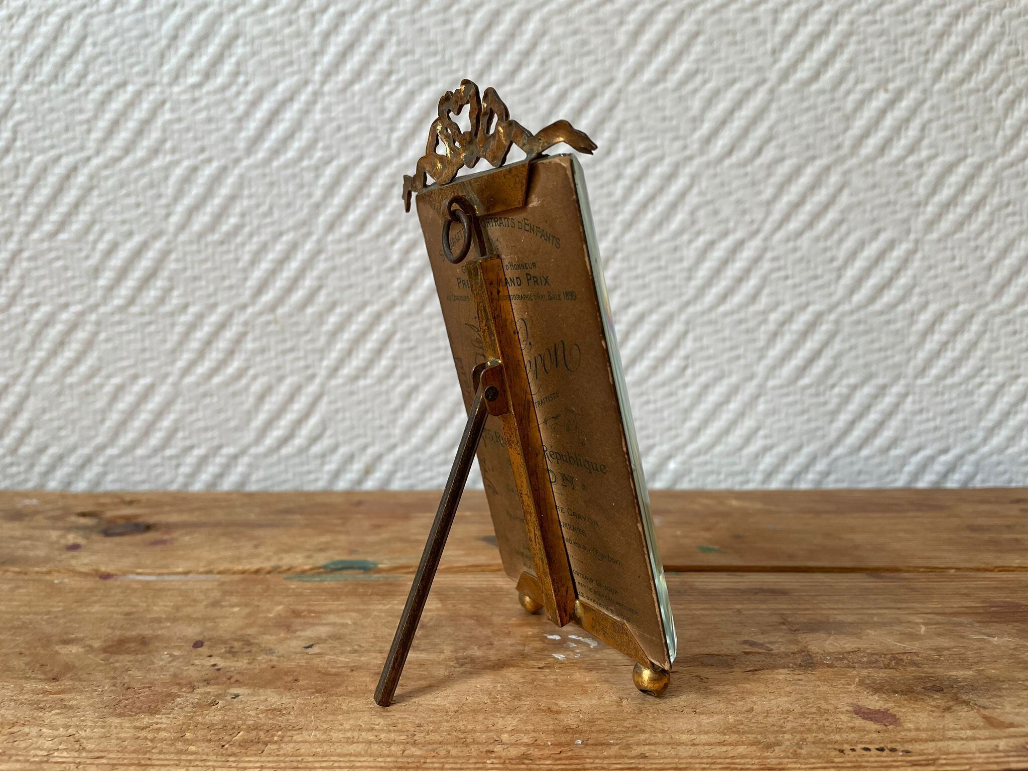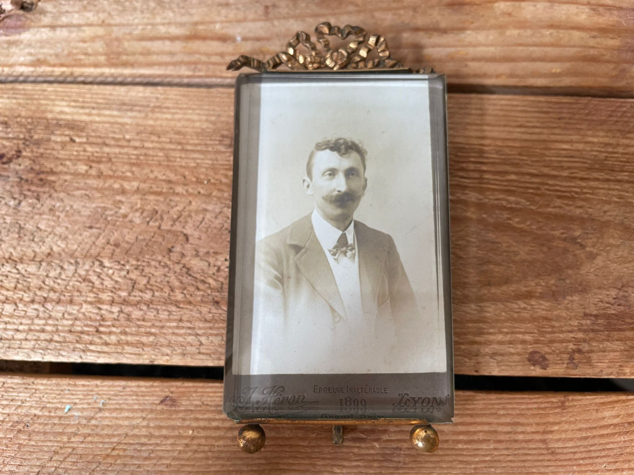 リヨンの蚤の市のマダムから譲り受けたアンティークの、ガラスと真鍮製のフォトフレーム。